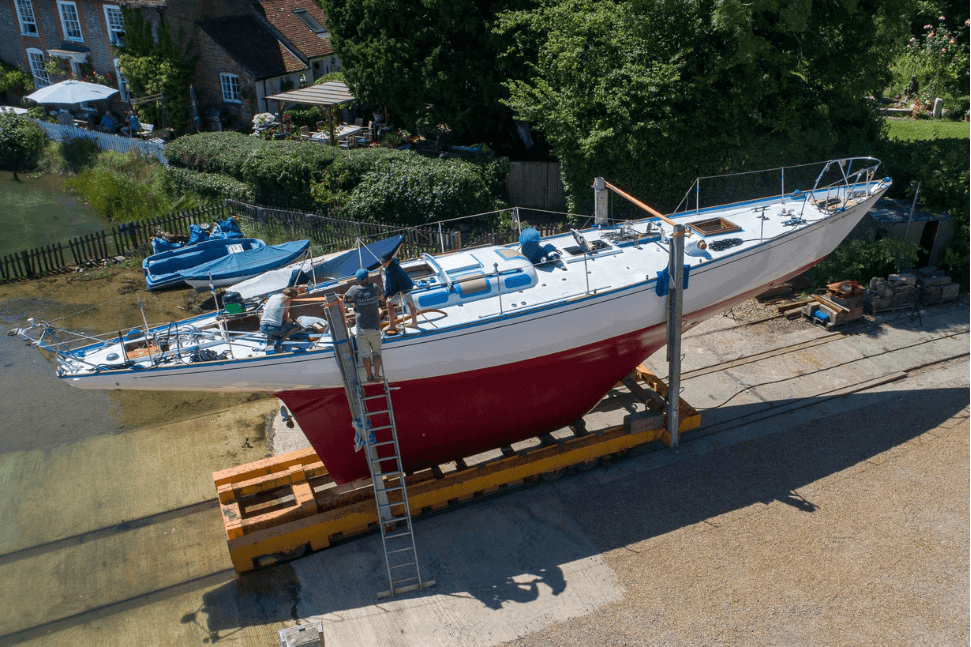 Unlike most other yards on the River Hamble, we have different options for lifting boats which allows us to accommodate many different shapes and sizes, including a winched slipway cradle for bigger boats, a travel hoist with slings and a Roodberg slipway cradle.